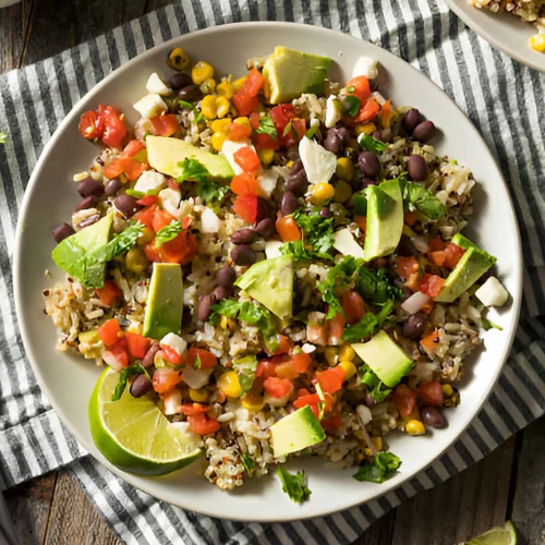 A fresh bowl with white rice, black beans, fajita veggies, fresh tomato salsa, roasted chili-corn salsa, and guacamole.